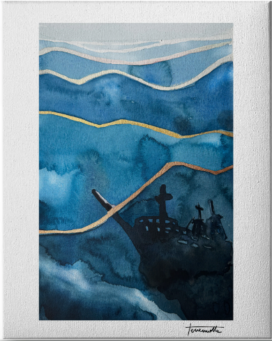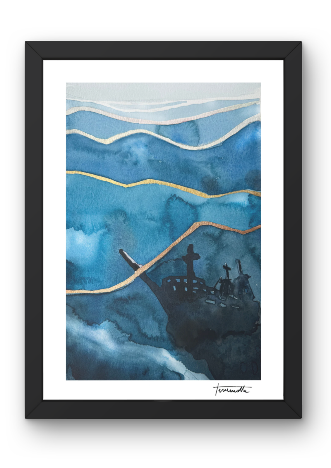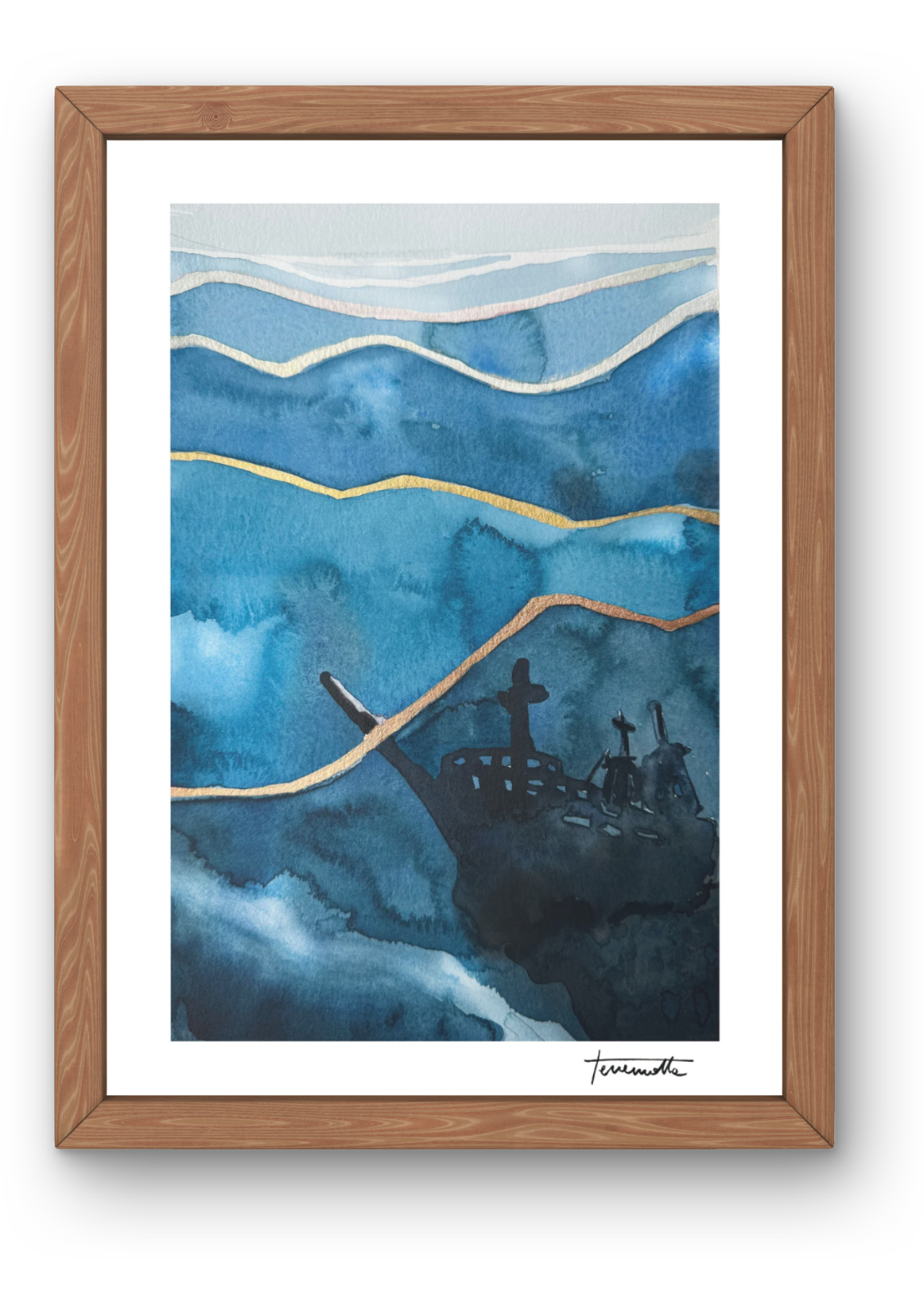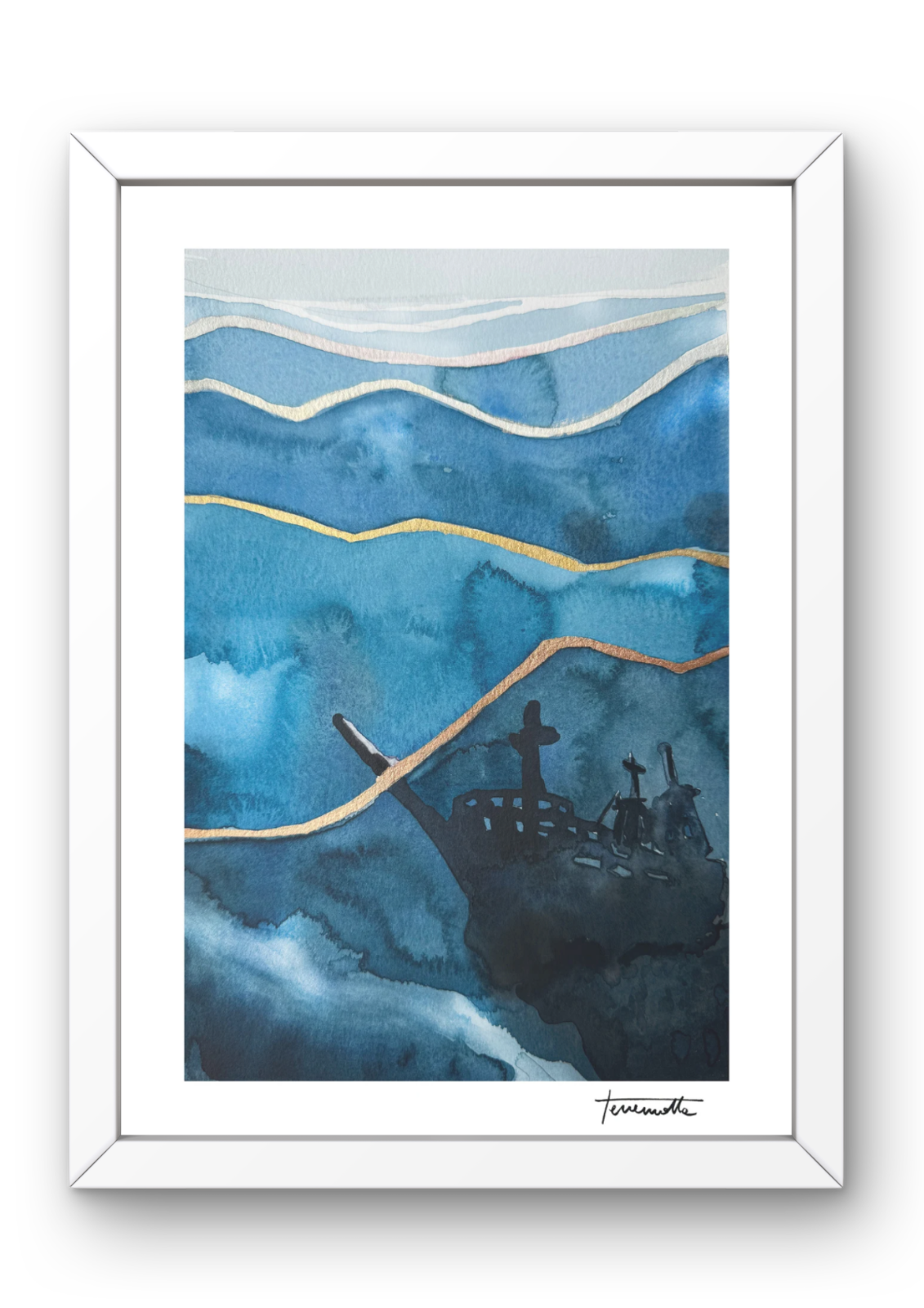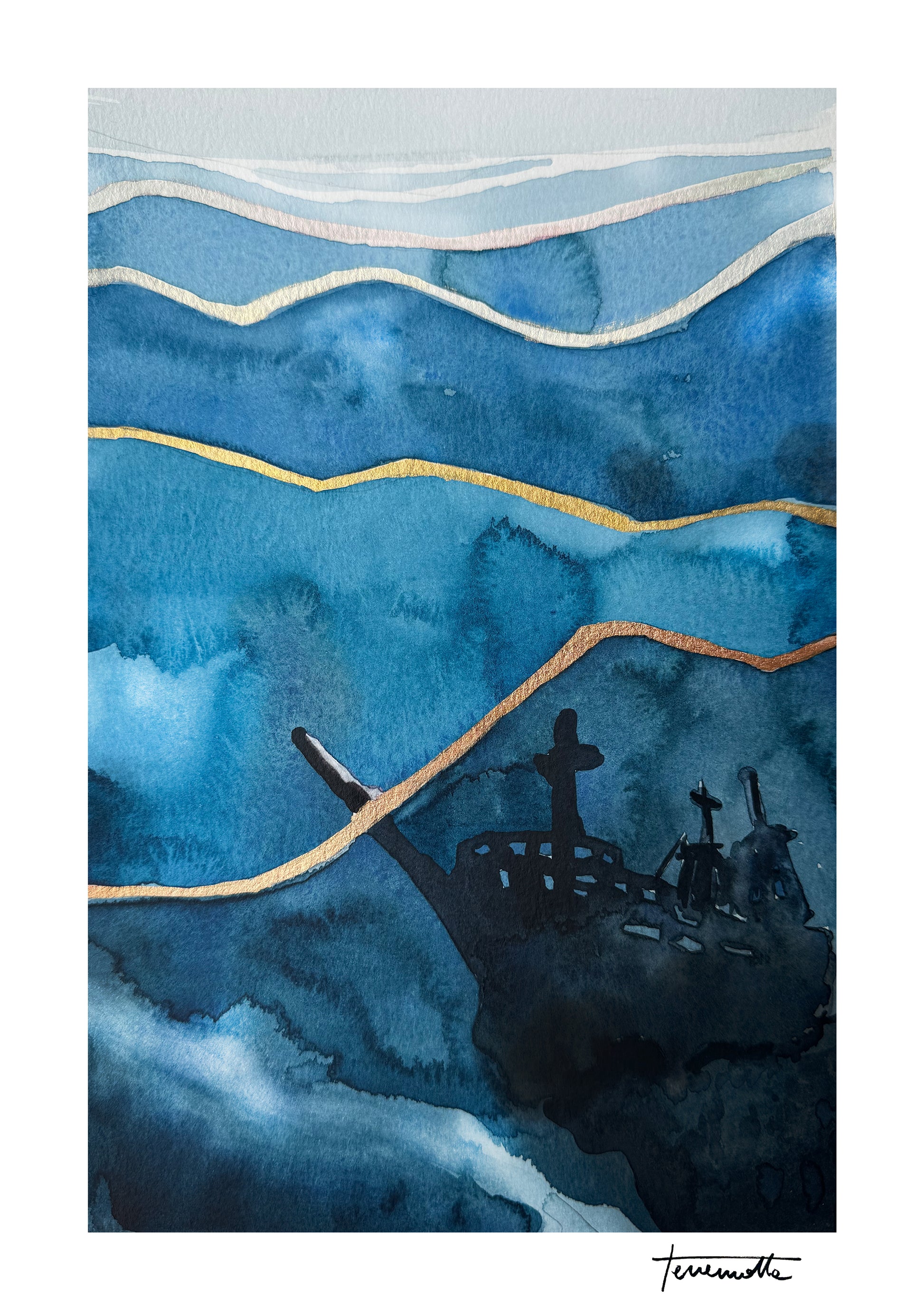 Esta lámina de acuarela hecha a mano y digitalizada representa un barco hundido. La técnica de acuarela brinda un efecto único y realista, mientras que la digitalización garantiza una alta calidad de impresión. Ideal para los amantes del arte y la decoración marítima.